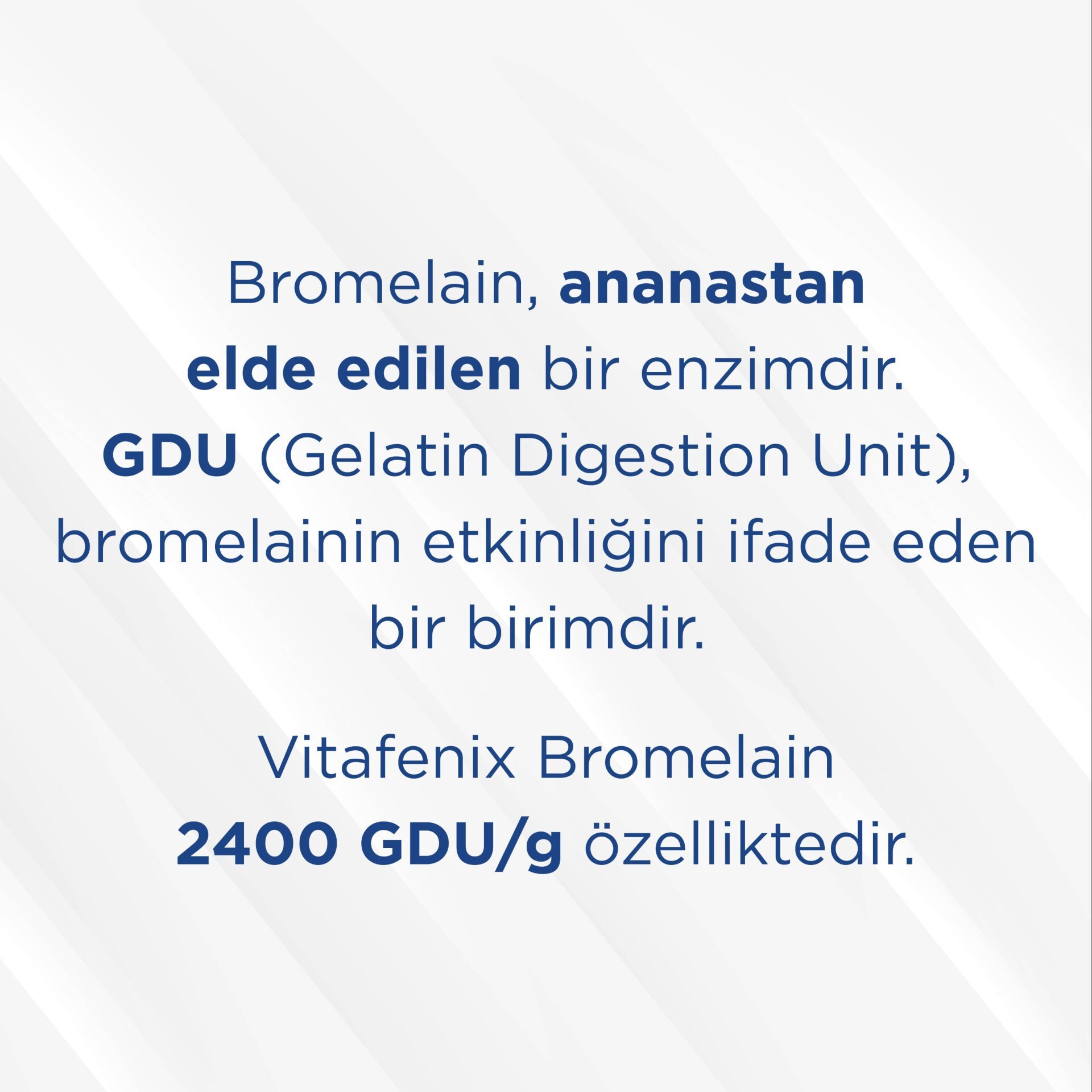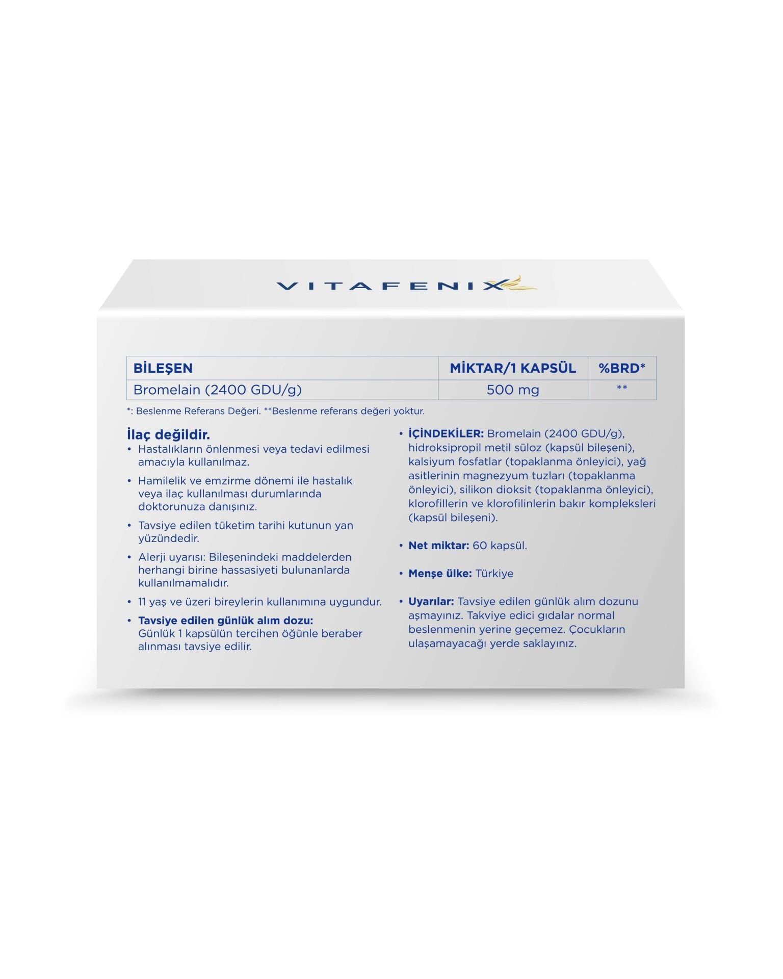 Vitafenix Bromelain Takviyesi her kapsülde 500 mg yüksek saflıkta bromelain içerir. Bromelain, ananas bitkisinin sap ve gövde kısmından elde edilen doğal bir proteolitik enzimdir. Ürün, 2400 GDU/g enzim aktivitesiyle yüksek sindirim etkinliği sunar. GDU (Gelatin Digestion Unit) değeri, hammaddenin laboratuvar ortamında belirlenen standardize sindirim gücünü ifade eder.
