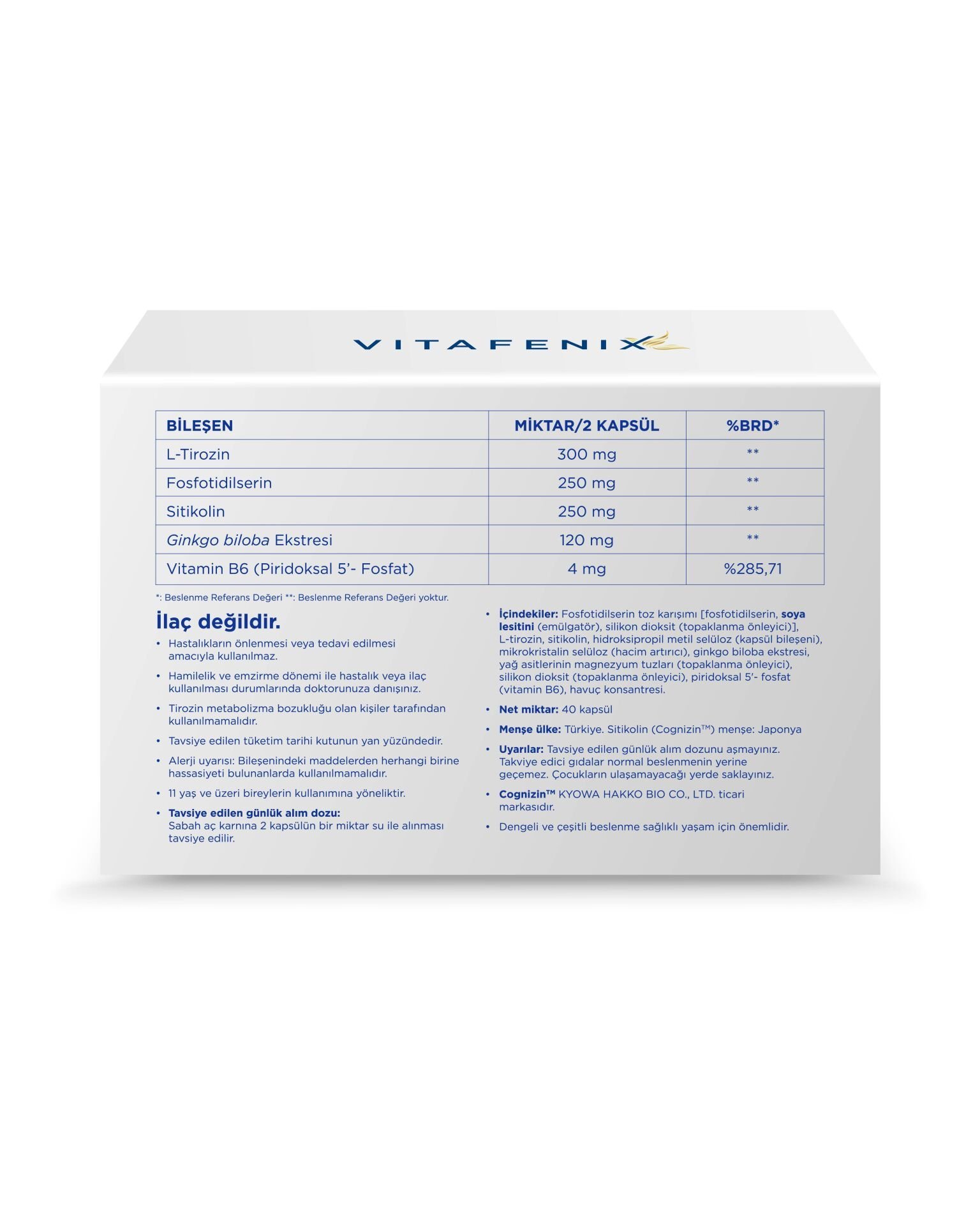 Vitafenix Cognifenix, fosfatidilserin ve sitikolin (Cognizin) merkezinde geliştirilmiş kapsül gıda takviyesidir. Bu iki bileşene ek olarak sinerjik etkiye sahip ginkgo biloba ekstresi, L-tirozin ve aktif vitamin B6 (P5P) içerir.