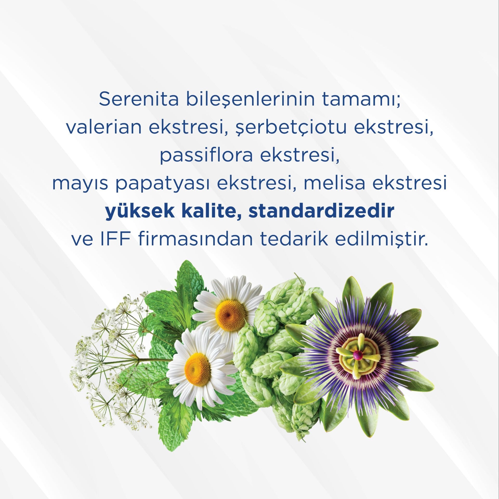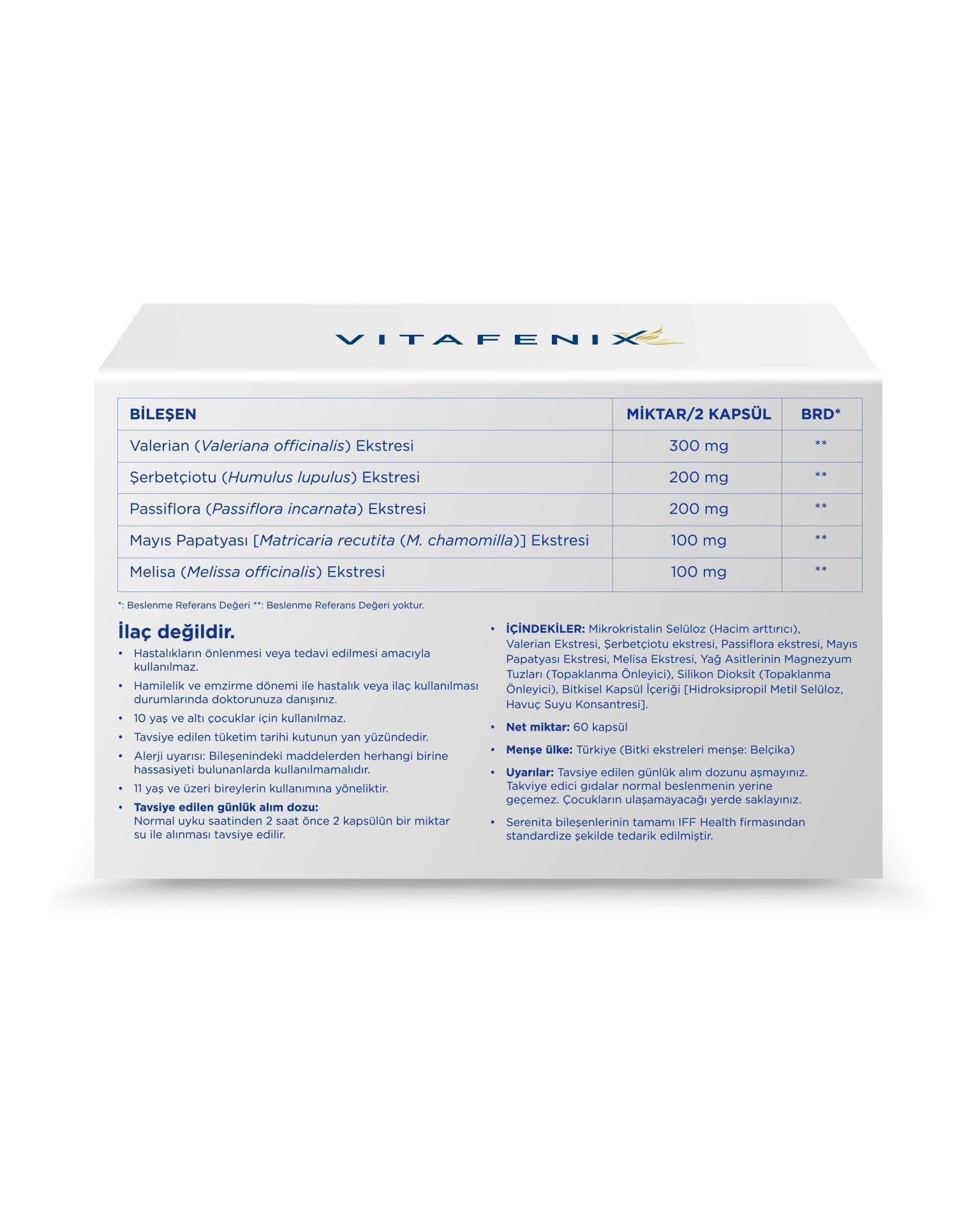 Serenita yüksek kalitede ve standardize valerian, şerbetçiotu, passiflora, mayıs papatyası ve melisa ekstrelerini içerir.